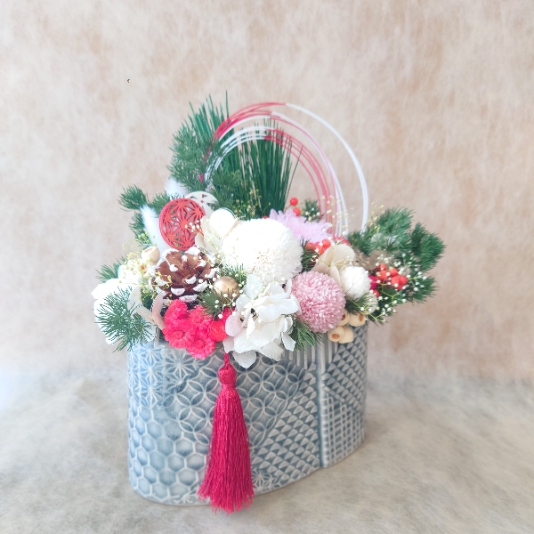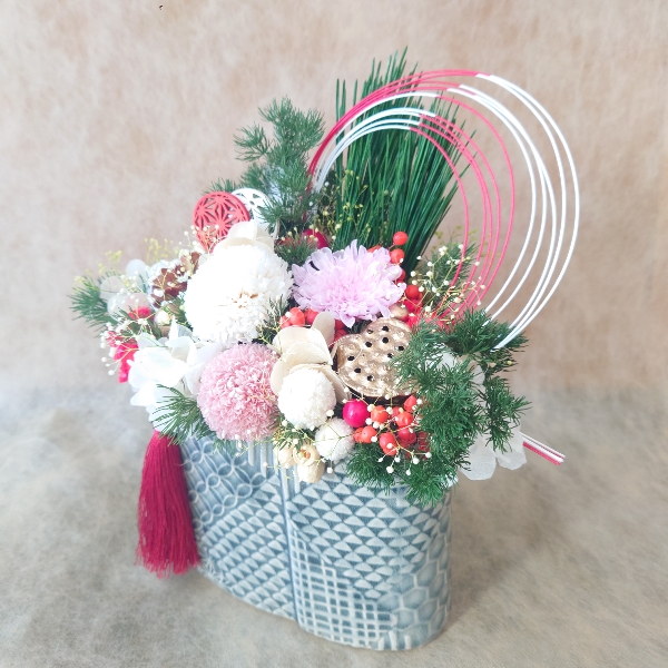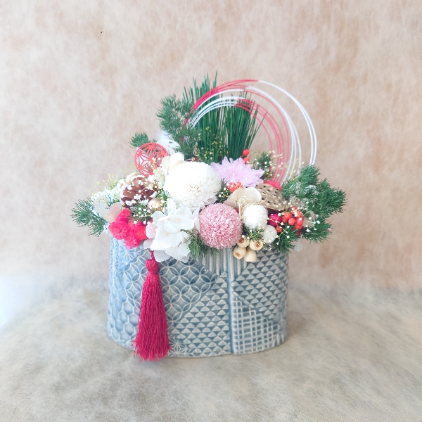 地模様の入った器に白、ピンク、赤のマムや小花と松、実などをふんだんに使いタッセルや水引飾り、木製の鞠柄の飾りをプラスして華やかに可愛らしく仕上げました。