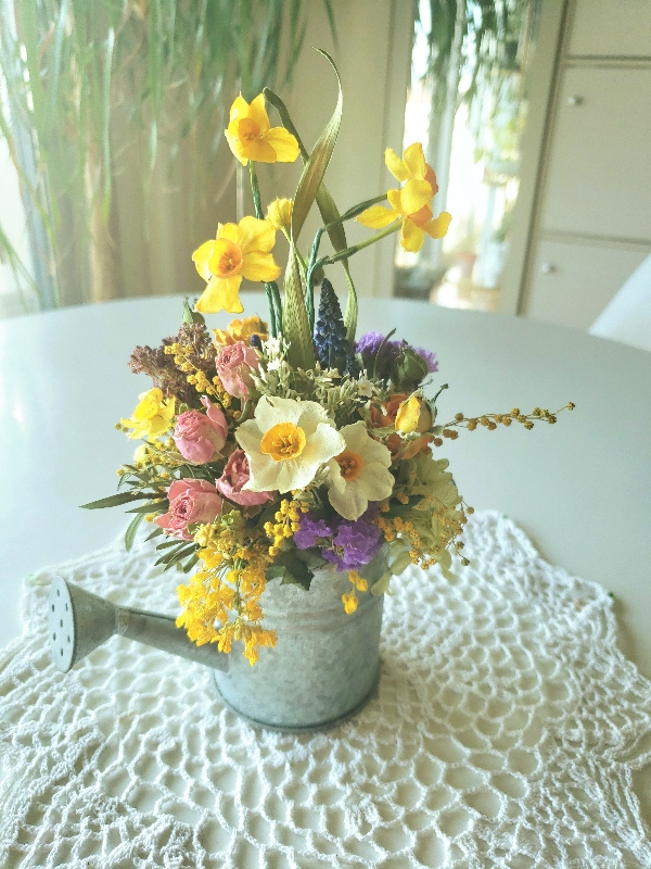 スイセン、ムスカリ、スプレーバラ、ナノハナなど春らしい色合いのドライフラワーをブリキのじょうろにアレンジしました。