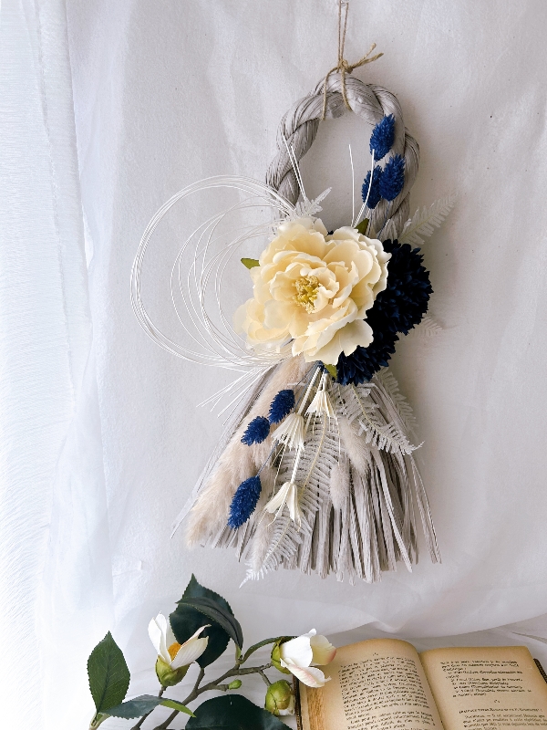 ライトグレーのわらルックタッセルベースに、ネイビーブラックのポンポンフラワーと大輪のピオニーをあしらいました。ネイビーのポアプランツがアクセントになっていて、シックな仕上がりになりました。