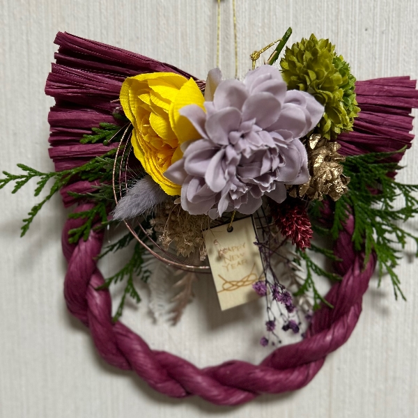 しめ縄リースの土台に造花やフレッシュなヒバ、木の実や水引などをグルーでつけました。