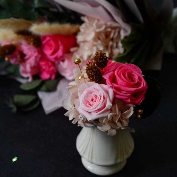 今回は小花などのサブ花材を淡い色にしましたが、ピンク系のローズにダークな寒色系をプラスすると男性へのギフトにも良さそうです。