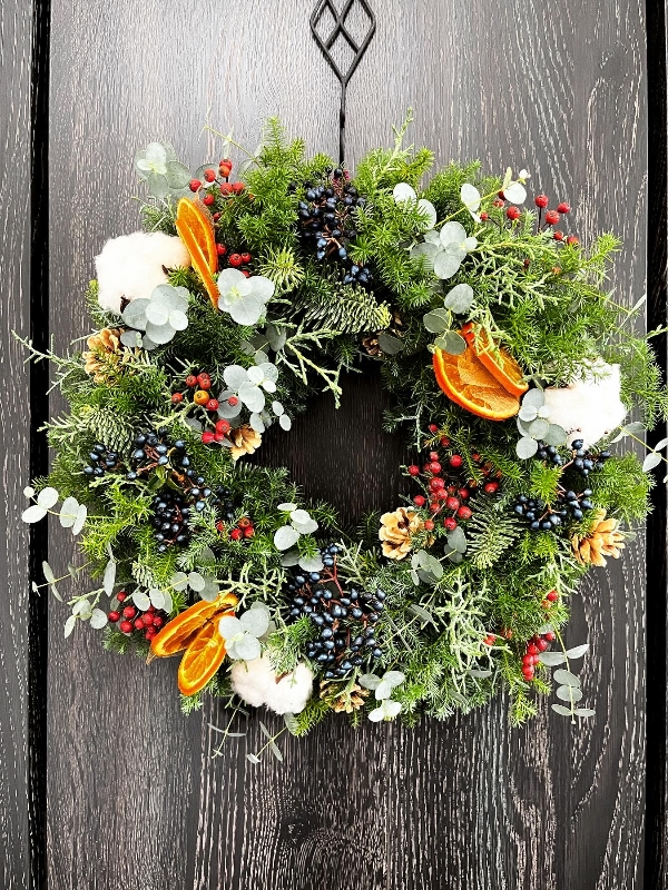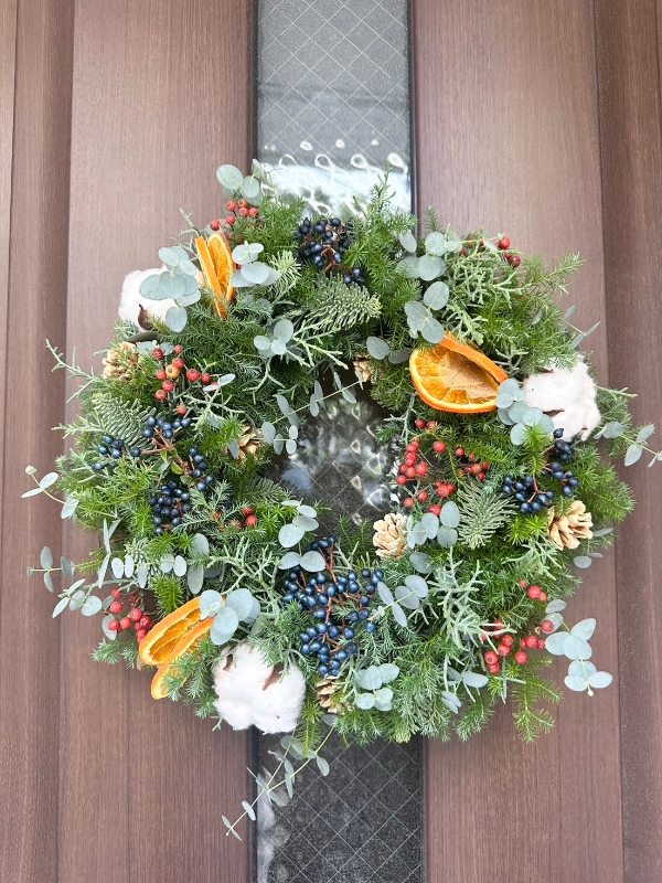 4種類のグリーンを贅沢に入れ、香りも豊かに、ビバーナムティナスの黒で大人シックに全体を引き締め、バラの実の赤と松ぼっくりでクリスマスを感じさせる冬リースができました。