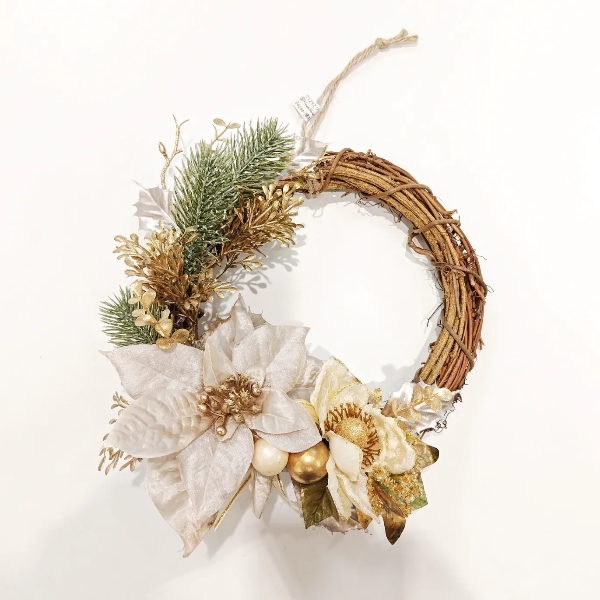 ポインセチアをメインに、クリスマスならではのキラキラ感を楽しめるリースです。