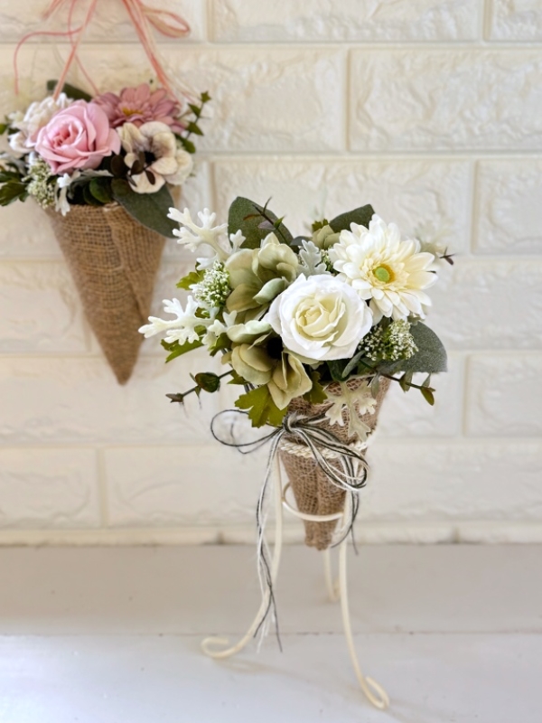 ブーケスタンドやグラス・花瓶に飾って楽しんでいただいても、壁掛けタイプとして玄関・お部屋のドアに飾っていただいても楽しんでいただけます