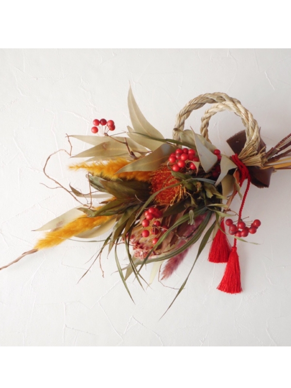 松などの常緑樹は使わずワイルドフラワーなどで仕立てたしめ縄飾り