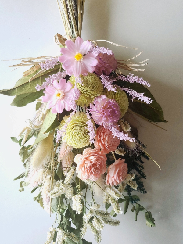 ドライやソラフラワー、プリザーブドフラワーを合わせた混合スワッグ。