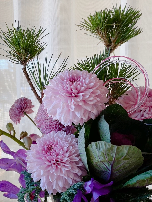 新春にぴったりな華やかなピンクのデコラマムとスプレーマムに、存在感のある山光松で上品にアレンジしました。