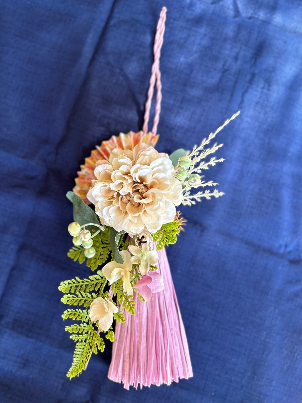 合わせるダリヤの色で雰囲気が変わり自分好みのしめ飾りが作れます。
