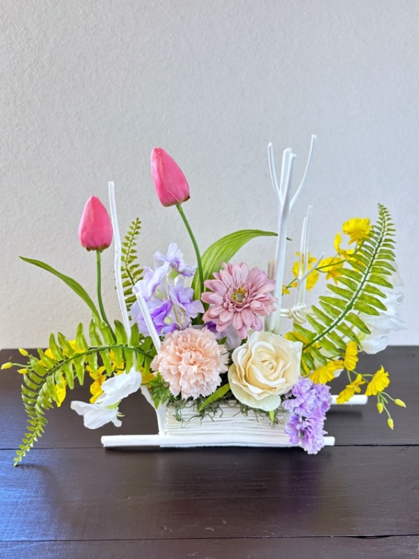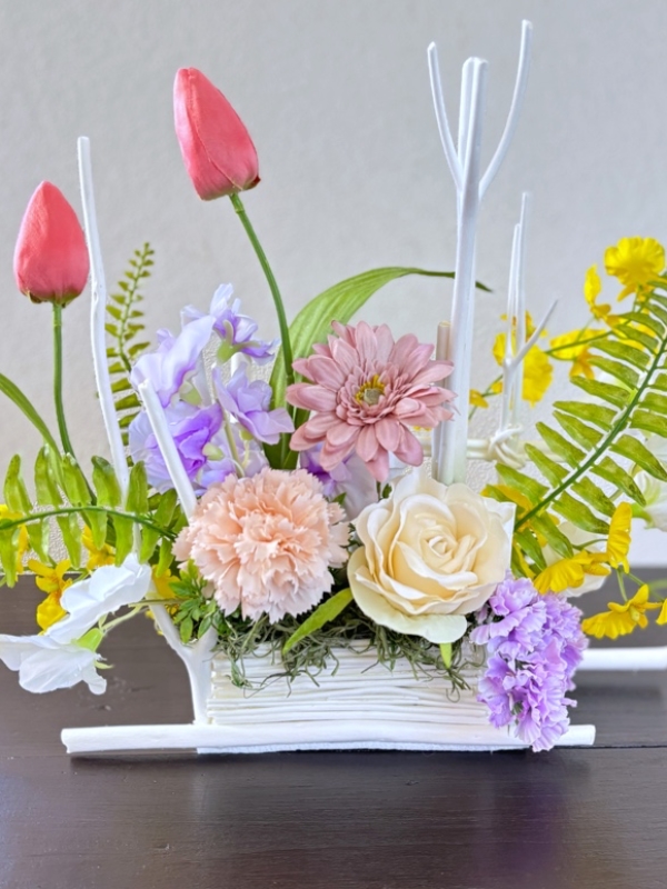 ミツマタで土台を作り、色とりどりの春らしい可愛い花々をバランス良くまとめ仕上げました