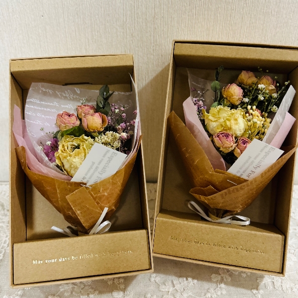 ドライフラワーのミニブーケを紙製BOXにsetしました。プラスチックのカバーがついています。
