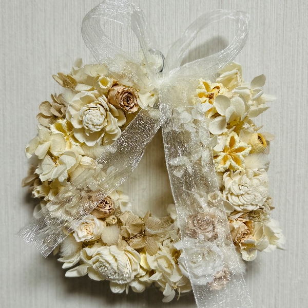 ホワイトにベージュを加えたプリザーブドフラワーとソーラーフラワー、木の実のリース。