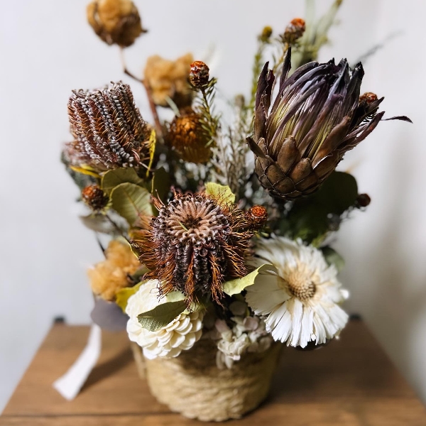 ナチュラルなバスケットに大ぶりのワイルドフラワーとソーラーフラワーをアレンジしました。