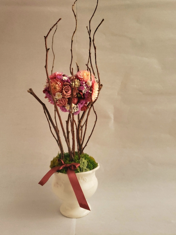 陶器の器をベースに、ハートのモチーフのフラワートピアリーをアレンジしました。