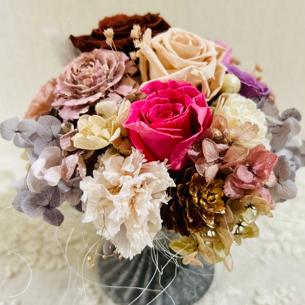 グレーのブリキ製のポットに、大ぶりのプリザーブドフラワーのバラやカーネーションをたっぷり飾りました。濃いピンクにグレーやベージュ、金色を合わせて可愛いく華やか雰囲気にまとめています。
