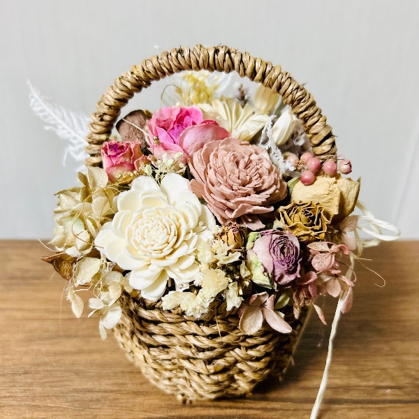 取手付きのバスケットに、ドライフラワーやソーラーフラワーをナチュラルにアレンジしました。