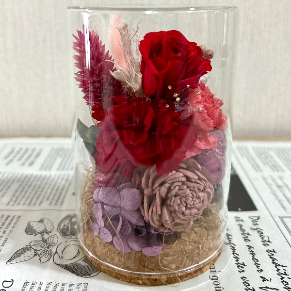 ガラスドームの中に、プリザーブドフラワーやソーラーフラワーをアレンジしました。還暦のお祝いに喜ばれました。