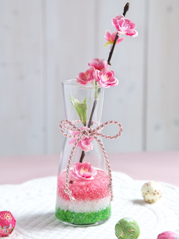 ガラスの花器にひし餅をイメージした3色のカラーサンドを詰め、マジカルウォーターという無色透明なシリコーン樹脂で固め、アーティフィシャルフラワー(造花)の桃の花をアレンジしました。
