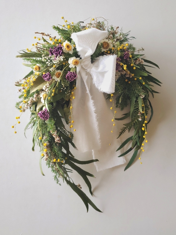 ドライフラワーの紫色のカーネーション、白いアンモビュームを添えて春らしい色合いに仕上げました。
