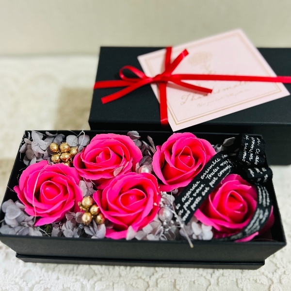 大ぶりのソープフラワーのバラとプリザーブドフラワーのグレーのアジサイのBOXアレンジメントです。バレンタインデーや母の日のイメージです。