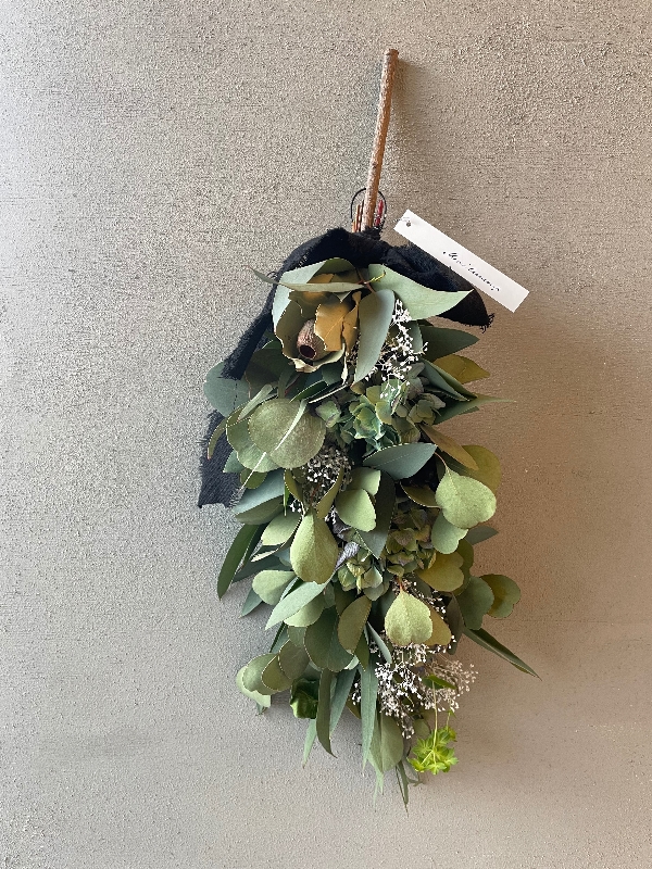ポポラス、ロングリーフ、ニコリー3種のユーカリと秋色アジサイをメインにスワッグを製作しました