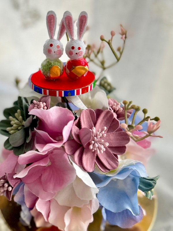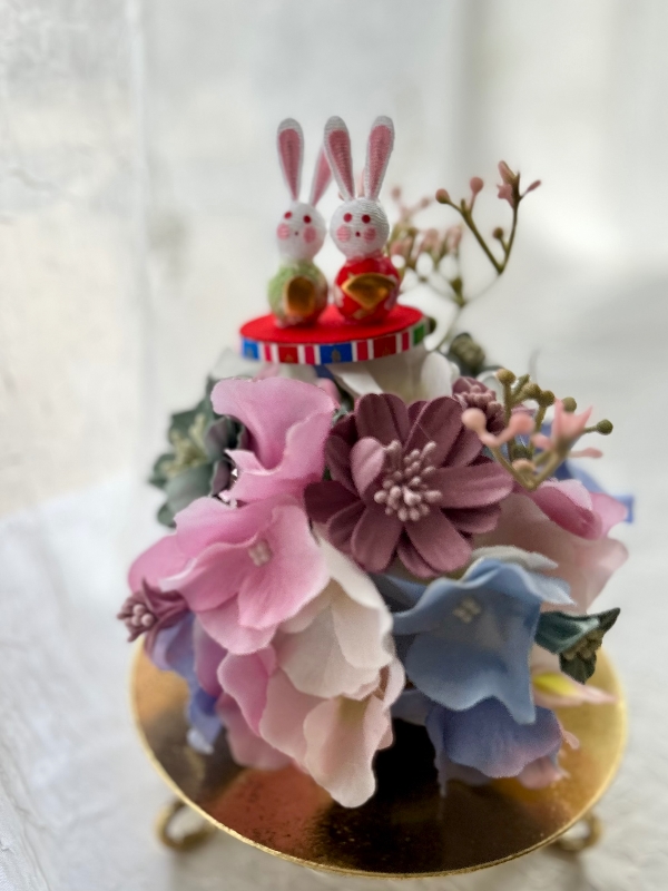 ピンクとブルー系のハイドランジアをたっぷり使ったふわふわの花ボールにうさぎのお雛様で、可愛さ一杯のアレンジです。