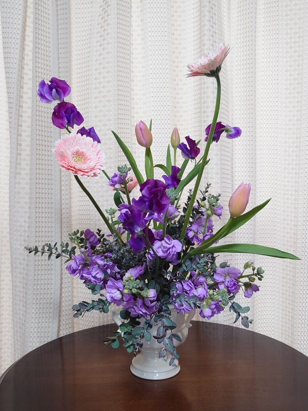 春らしいチューリップ・スイトピーなどパープルピンク系のお花でデザインしています。