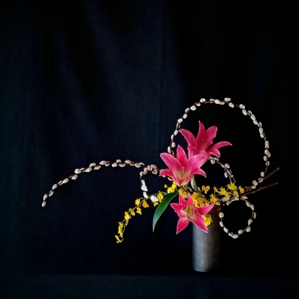 銀芽柳とユリ、オンシジウムを取り合わせました。モコモコして可愛らしい銀芽柳を円に形づくり、ユリは寄り添うようなイメージでいけました!オンシジウムの黄色いラインはアクセントになり、作品を引き締めています。