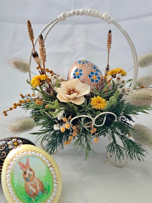 複数種のプリザーブドグリーンを使用することでナチュラルに。イースターの象徴である手作りイースターのエッグをあしらい、可愛らしく仕上げております。