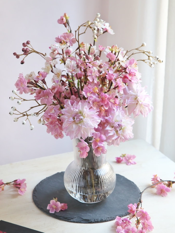 アーティフィシャルフラワー(造花)の桜とダリア、野ばらの実をガラスの花器にアレンジしました。