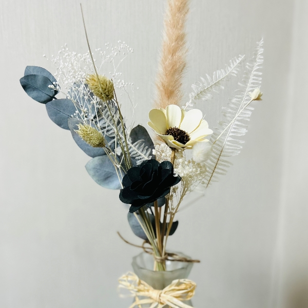 モノトーンのソーラーフラワーとドライフラワーを使ったシンプルなブーケです。