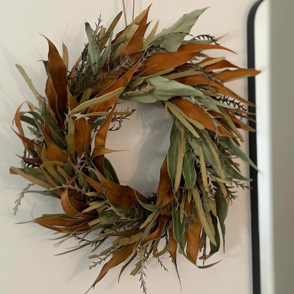 グレビレアゴールド、アイバンホー、ウッディペアの葉のドライフラワーを使ったナチュラルテイストのリースです。