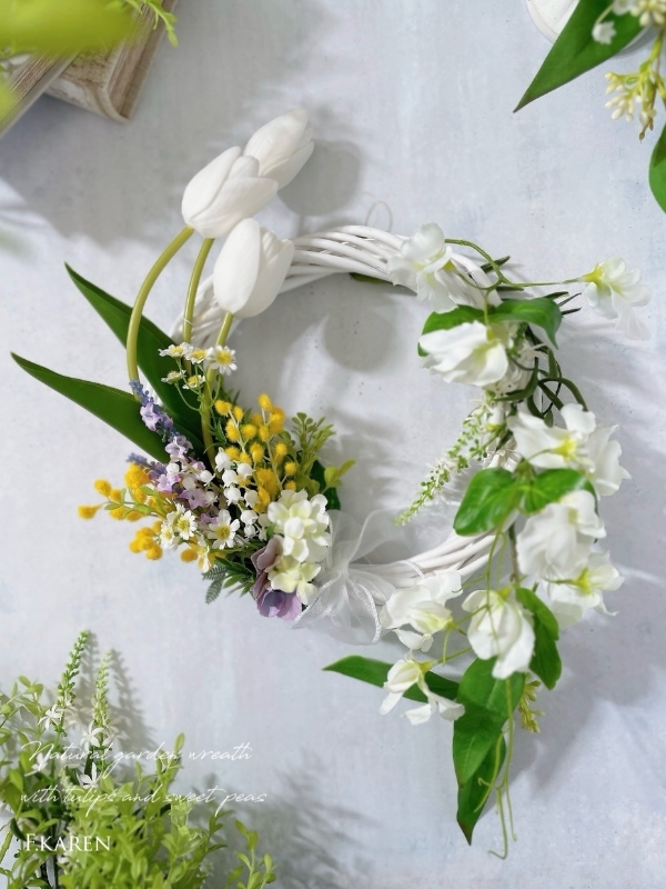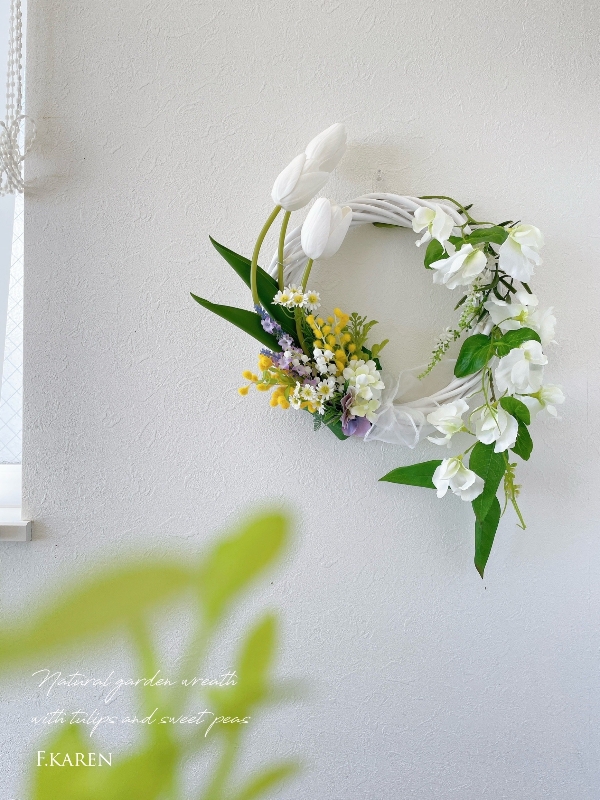 25cmリースベースを使用、玄関ドアリースに爽やかな春を飾って頂けます