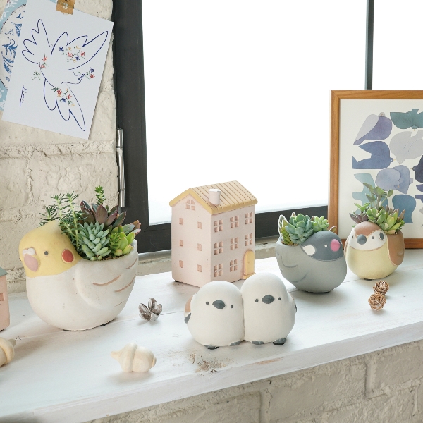 セメント製の小鳥モチーフの鉢とオーナメントのシリーズ。