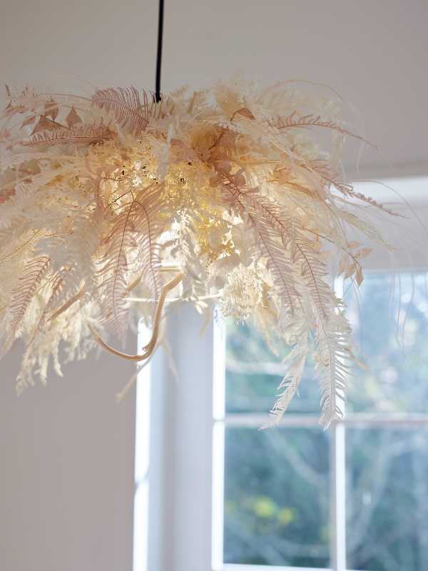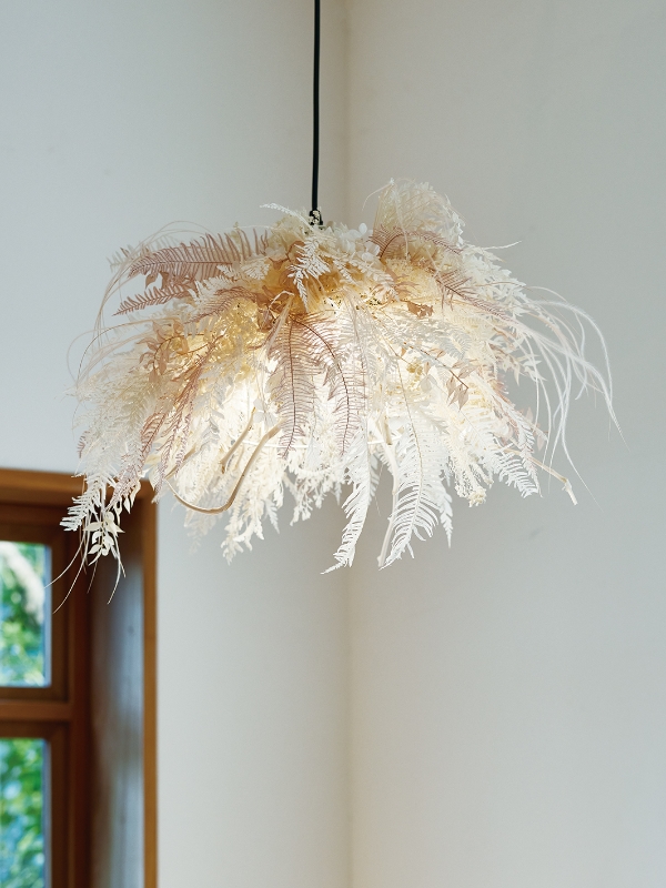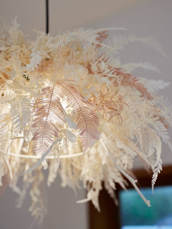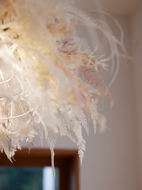 シダの葉とフェザーグラスをつかったふんわりおしゃれなインテリアアレンジ。
