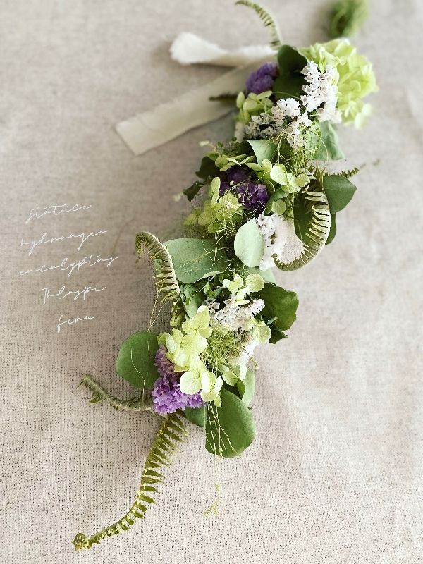 スターチス、アナベル、タラスピ、ユーカリ、シダを小さく束ねながらガーランドにしました