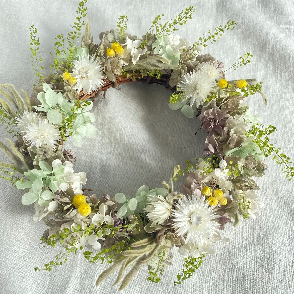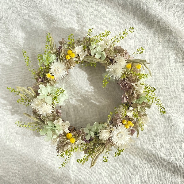 花やグリーンの生き生きとした躍動感とナチュラルな姿をアーティフィシャルフラワーとプリザーブドフラワーで表現しています。