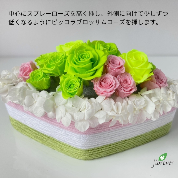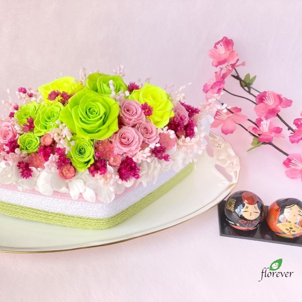 ローズパレット(ファンシー)を1箱使用して、華やかで愛らしいひな祭りのアレンジメントをご紹介。
