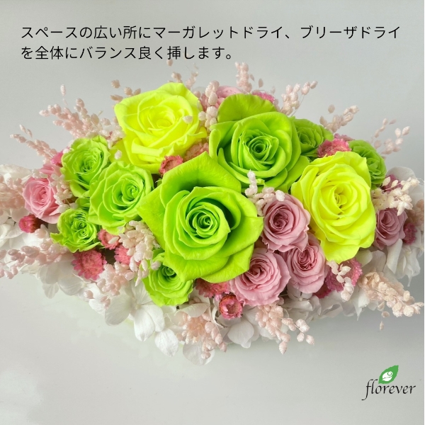 可愛らしく、元気の出る色味なのでイエロー系の花材を足してイースター向けのアレンジや、パールホワイトを足して爽やかに春色のリースにも。