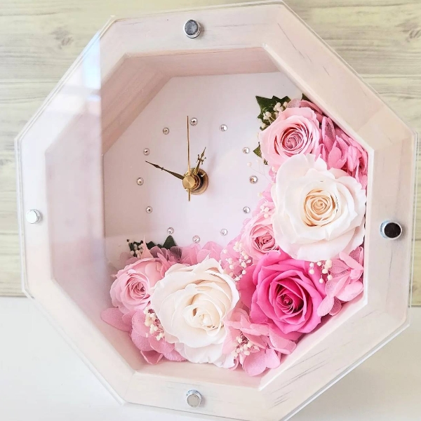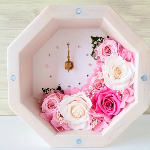 ピンクとホワイトのふんわり癒しのカラーの八角花時計です。