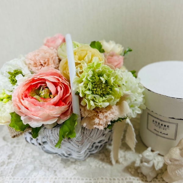 スカビオサやラナンキュラスなど、淡い色合いの春の造花でアレンジメントを作りました。