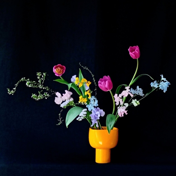 春の草花を主に、色とりどりの花材を使っていけました。首を傾げたようなチューリップや雪柳のやさしい線、甘い香りを放つスイートピーに春を感じます!