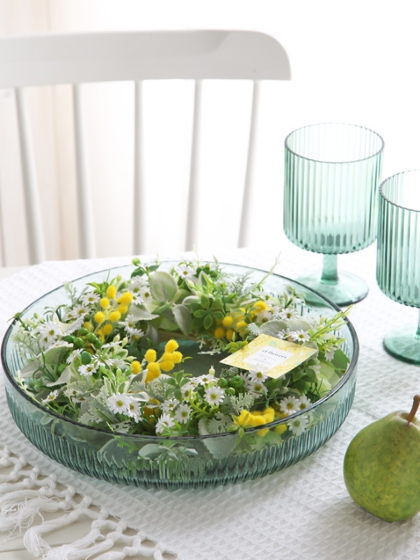 ブルーグリーンのガラスのプレート付ですので、テーブルフラワーとして飾ることもできますし、リースはそのまま壁にかけてご利用いただけます。