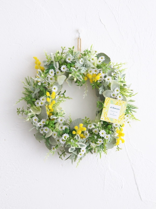 ユーホルビアやタイム・ミントなどのハーブと、小花やミモザを合わせた爽やかなグリーンリースです。