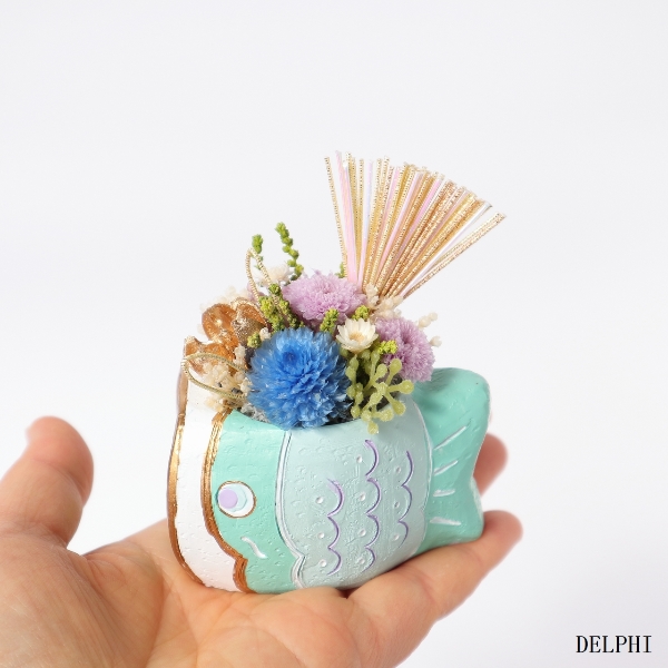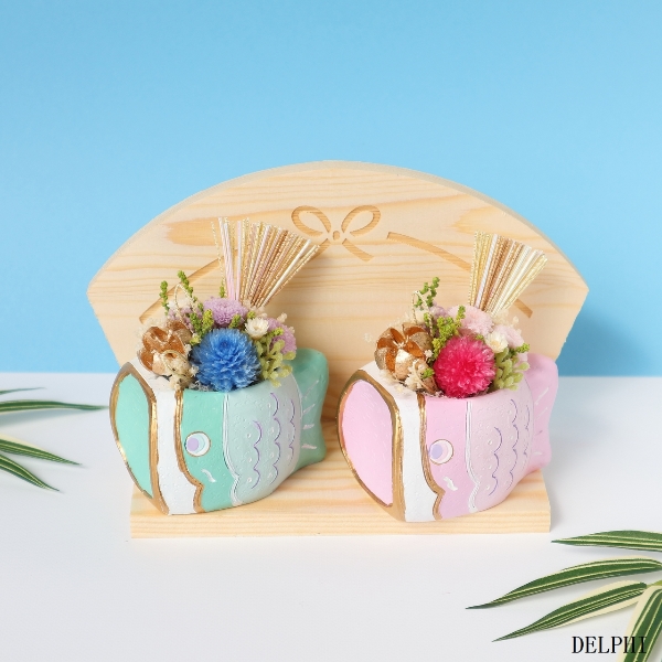 パステルカラーの鯉のぼりの花器にプリザーブドフラワーの千日紅やマムをアレンジしました。