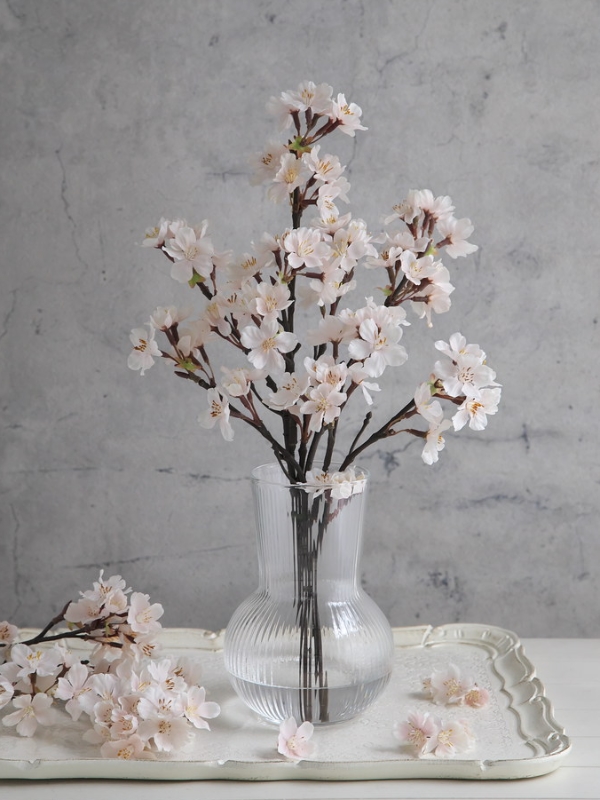 マットな質感でソメイヨシノにそっくりな桜を2枝、シンプルにガラスの花器にアレンジしました。
