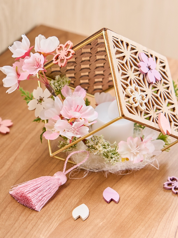 ワイヤーキューブの側面に四角紋様プレートを貼り付け、LEDキャンドルライトと桜をアレンジした作品です。