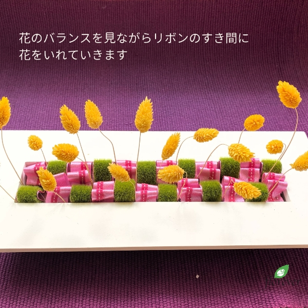 横長のスクエアのアレンジメントは、少ない花材で作る場合、市松模様に入れたリボンの隙間に花首を直接挿し、ピックで装飾してモダンな立て掛けアレンジメントにしても素敵です。(pic.8)