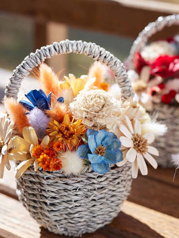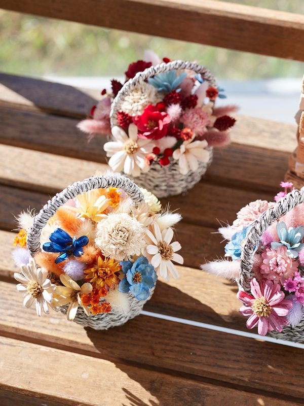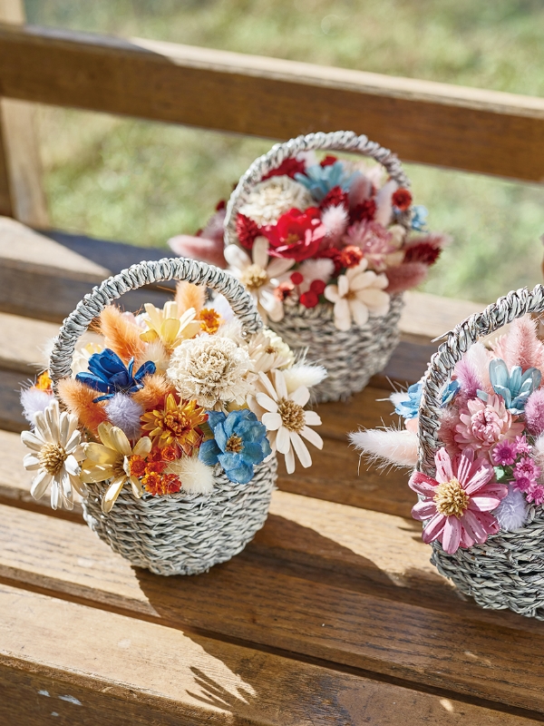 ドライフラワーやハンドメイドフラワーを使ったバスケットアレンジ。