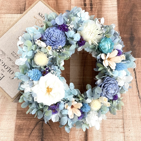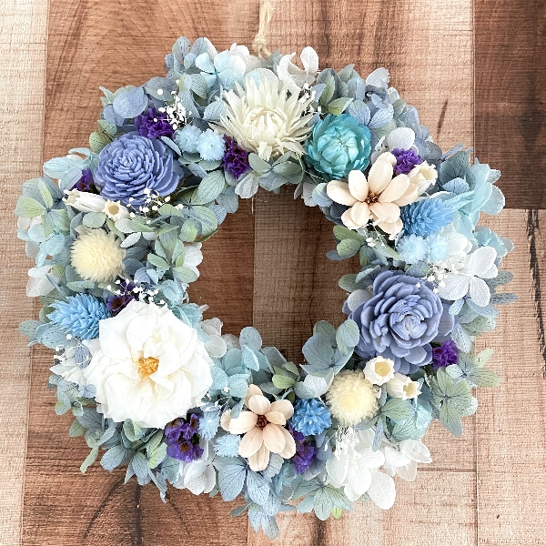プリザーブドフラワーの紫陽花やバラを使ったリースです。フレンチマリアンヌのバラをポイントに全体的に爽やかなイメージで作りました。