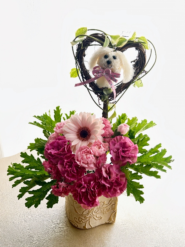 ハートの中には、プリザーブドフラワーのピンポンマムで作った垂れ耳うさぎがいます。